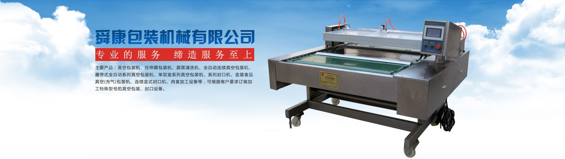 諸城市舜康包裝機械有限公司是一家集研發(fā)、制造、銷售、服務于一體的包裝機械生產企業。公司技術力量雄厚,機械加工和檢測設備齊全。采用國外先進技術及元器件,產品設計新穎,性能穩(wěn)定可靠,品種齊全。 主要產品:自動連續(xù)真空包裝機、滾動式全自動系列真空包裝機、單雙室系列真空包裝機、系列封口機、盒裝食品真空(充氣)包裝機、連續(xù)盒式封口機、肉食加工設備等,可根據客戶要求訂做加工特殊型號的真空包裝、封口設備。 舜康公司堅持“科技為本,質量先行,憑信譽謀發(fā)展,靠質量求生存”的經營理念,為廣大客戶朋友提供優(yōu)異的產品與服務。           舜康熱忱歡迎廣大國內外客戶朋友蒞臨參觀指導。...